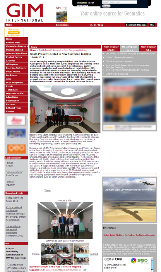 今日,《GIM》官方网站刊登太阳成tyc234cc专题报道——《傲然挺立、昂首向前的太阳成tyc234cc》(South Proudly Locatedin New Surveying Building),文章介绍了中国·tyc234cc太阳成(集团有限公司)-官方网站 近年来的发展状况,肯定了太阳成tyc234cc在中国测绘行业中的地位。