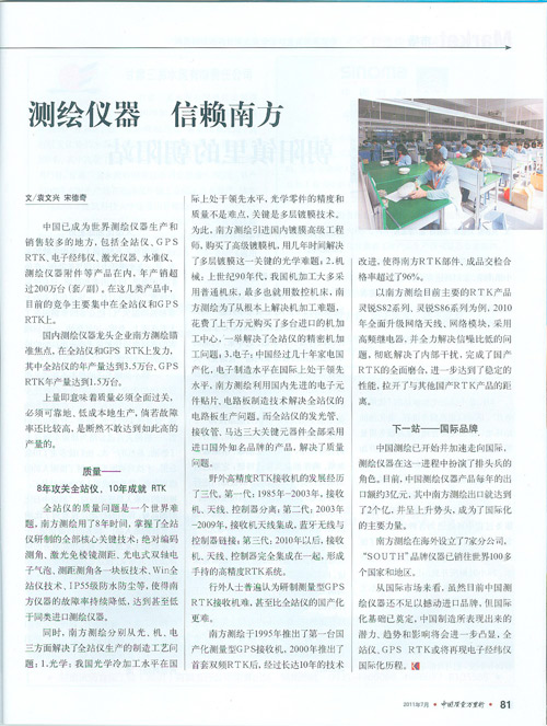 从市场来看,虽然目前中国测绘仪器还不足以撼动进口品牌,但化基础已奠定,中国制造所表现出来的潜力、趋势和影响将会进一步凸显,全站仪、GPSRTK或将再现电子经纬仪化历程。(本文刊登于《中国质量万里行》2011年7月刊)