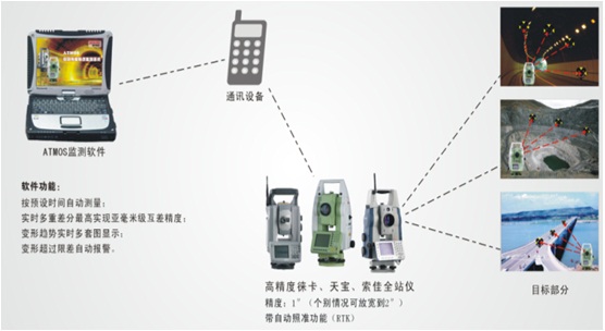 全站仪自动监测系统由高精度自动照准型全站仪、目标棱镜、SMOS软件及计算机、通讯模块四大部分构成。该系统将自动完成测量周期、实时评价测量成果、实时显示变形趋势等智能化的功能合为一体,是进行各类建筑物自动变形监测、滑坡监测、地铁监测、高铁线路、桥梁、水库大坝、露天矿开采、矿山尾矿坝等形变监测的理想系统。